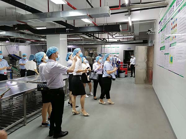 2021年5月31日下午,鮮而美餐飲公司一行17人到我公司參觀交流。在公司運營監(jiān)管部嚴壯云主任的陪同下參觀了食品檢測室、凈菜加工中心、秀苑餐廳等,并詳細了解我公司無水廚房建設(shè)情況。