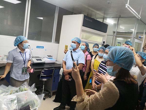 2021年7月30日上午,百色市右江區(qū)市場(chǎng)監(jiān)督管理局組織右江區(qū)部分高校和餐飲單位一行41人到我公司考察交流,在公司總經(jīng)理孔宇的陪同下分別參觀了凈菜加工中心、食品檢測(cè)室、秀苑餐廳等。