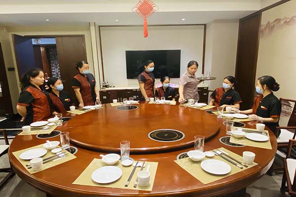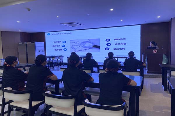 培訓(xùn)內(nèi)容包括理論知識(shí)和實(shí)操兩大部分,由各接待餐廳負(fù)責(zé)人根據(jù)餐廳實(shí)際,對(duì)員工進(jìn)行儀容儀表要求、服務(wù)禮貌用語、擺臺(tái)注意事項(xiàng)、上菜技巧、處理投訴問題等綜合服務(wù)素質(zhì)理論培訓(xùn);實(shí)操培訓(xùn)包括擺臺(tái)、斟酒倒茶、餐巾折花、上菜、收臺(tái)等,并實(shí)景演練處理投訴問題。