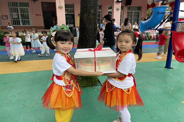 小朋友們看到五彩的節(jié)日蛋糕歡呼雀躍著,每個班由小朋友代表一起抬著大蛋糕回教室,期待著與同學(xué)一起品嘗。